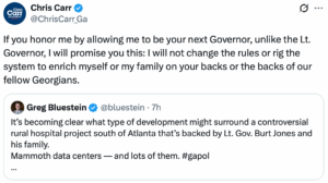 The Atlanta Journal-Constitution revealed yesterday that Jones’ father is planning to build 13 “mammoth” data centers as part of the construction of a hospital site that was made possible by a law Jones himself pushed in the State Senate. Jones has received years of sharp criticism for backing multiple proposals to roll back rules on where hospitals can be built in a way that would enrich his family. That rule change meant a big pay day for the Jones family by allowing a private hospital to be built on land owned by Jones’ father.