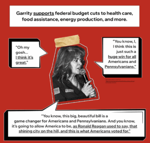 The website highlights how Garrity applauded stripping away health care and food assistance, while killing jobs and raising everyday costs and energy prices for families across the Commonwealth — even going so far as to call it a “huge win.”